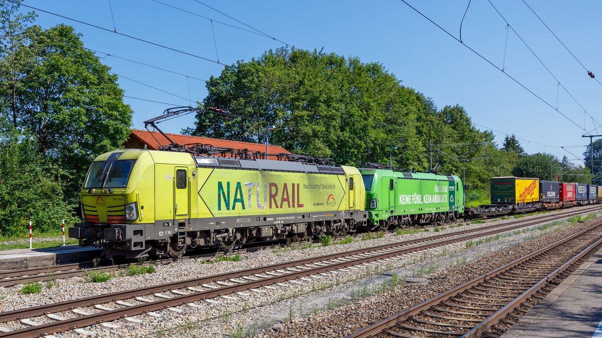 Der kombinierte unbegleitete Ladungsverkehr dominiert den Güterverkehr auf der Relation München-Rosenheim in Richtung Brenner bzw. die Gegenrichtung. Auf dem Bild ist 91 80 6193 559 gemeinsam mit einer Schwesterlok am 15.07.2024 an der Spitze eines solchen Zuges bei der Durchfahrt durch den Bahnhof Aßling in Richtung München zu sehen. Mathias May