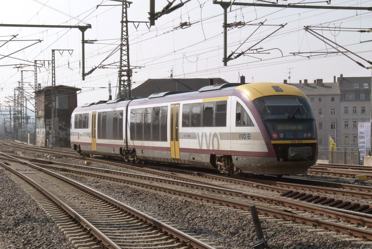 23. März 2015, Bahnhof Dresden-Neustadt. Tw 642 372 fährt als SBS 74518 nach Königsbrück  12:33 Uhr ab.