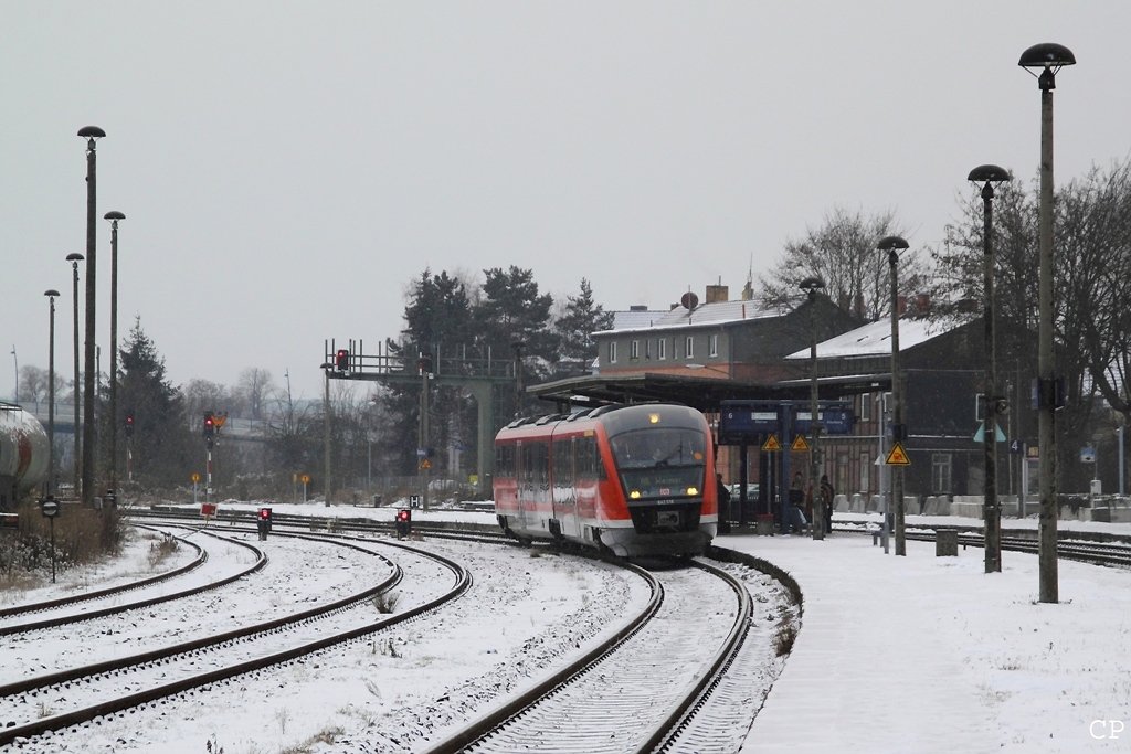 Am 19.12.2009 herrschte klirrende Kälte in Göschwitz, als wir auf unseren Zug nach Altenburg warteten. In der Vorweihnachtszeit wurden einige RE der Relation Erfurt - Gera - Altenburg von 612ern auf Ludmilla umgestellt, so auch unserer RE 3623. 232 569-4 zieht den Zug aus einem y-Wagen und drei n-Wagen. Wie lange ist es her, dass man in Thüringen solche Züge im planmäßigen Betrieb sehen konnte?! Christopher Pätz