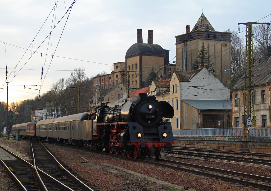 Am Wochenende 4.-6.Dezember war 01 519 der Eisenbahnfreunde Zollernbahn in ihrem ehemaligen Einsatzgebiet Saalfeld/Gera unterwegs. Am Sonnabend dem 05.12. veranstaltete man eine kleine Rundfahrt von Gera nach Glauchau ins dortige Bahnbetriebswerk. Hier, bereits wieder auf der Rückfahrt, erreicht der Zug am Nachmittag den Bahnhof mit dem längsten Bahnsteig Deutschlands, Gößnitz/Thüringen. René Richter