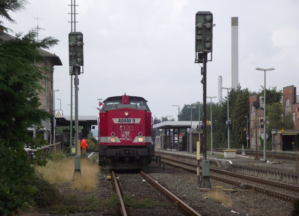 Adam 9 (202 520-3) steht am 3. August 2011 mit einem Schotterzug auf Gleis 1 im Bahnhof Kulmbach und wartet auf die Überholung durch eine Agilis. Aufgenommen vom BÜ Kronacher Straße. Frankenwaldbahner