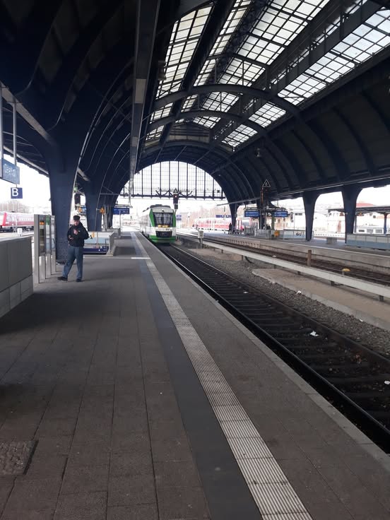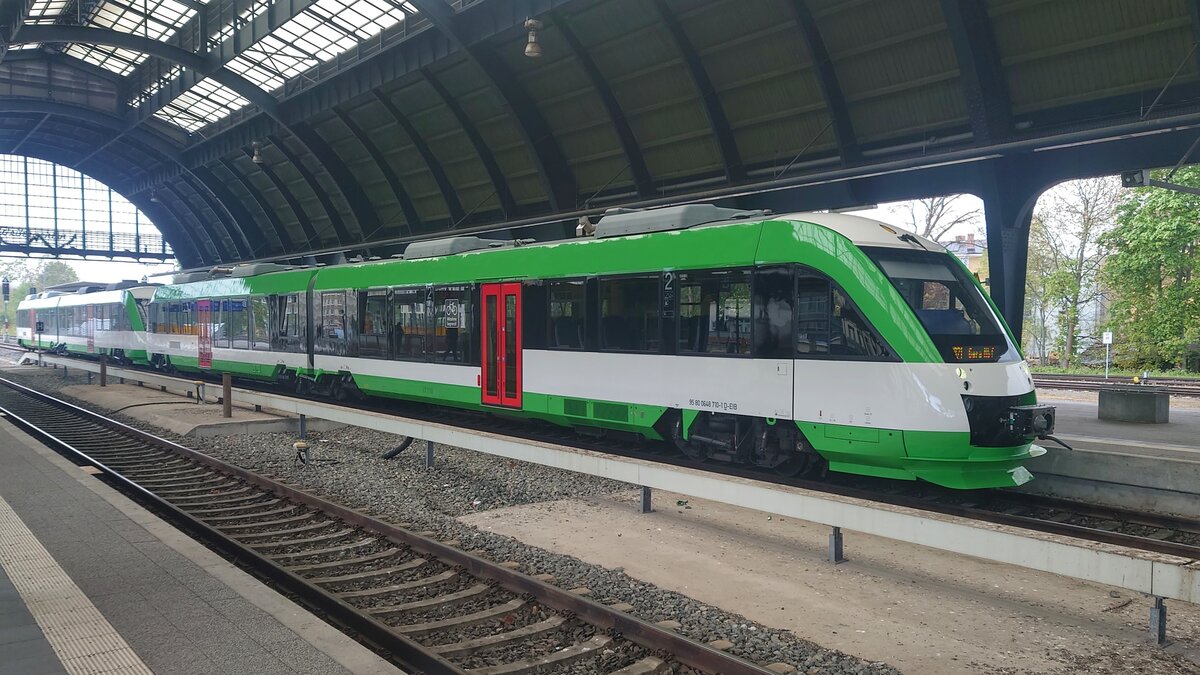 Zwei der von der Bayerischen Regiobahn übernommenen Triebwagen als RB 21 Gera Hbf - Weimar im Design der Erfurter Bahn in Gera Hbf am 25.4.24. Heinz Bergner