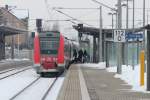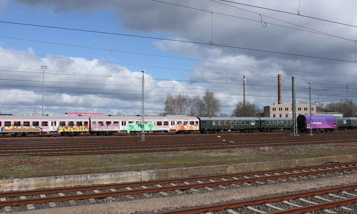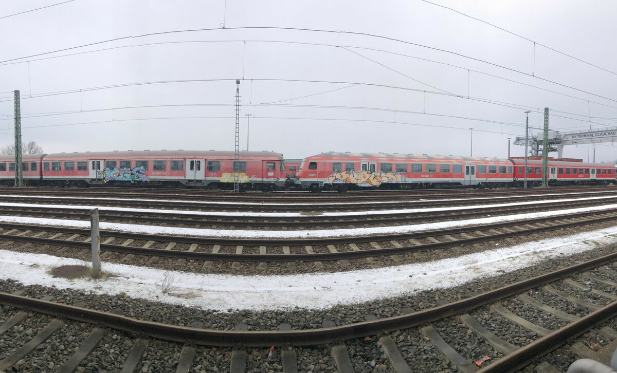 Zu sehen sind 2 n-Steuerwagen. Ein Karlsruher Kopf und ein Wittenberger Kopf. Sie sind inmitten einiger anderer Mittel- und Steuerwagen auf den Gütergleisen des Bahnhofs Glauchau (Sachs) abgestellt. Beschriftet sind sie noch mit DB Regio. Weiter rechts steht ein y-Wagen, ebenfalls noch mit DB Regio beschriftet. Dahinter, außerhalb des sichtbaren Bereichs, steht ein n-Steuerwagen der WEE (Weser Ems Eisenbahn). An einem Aufkleber vom "3 Löwen Takt" (heute Bwegt) ist erkennbar, dass der Karlsruher Kopf ehemals in Baden-Württemberg im Einsatz war. Der Wittenberger Kopf trägt einen Aufkleber vom "Bahnland Bayern". (Zu sehen unter den Führerstandsfenstern).