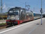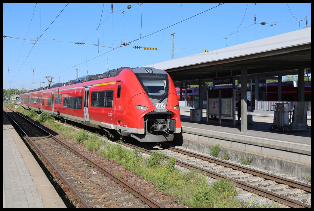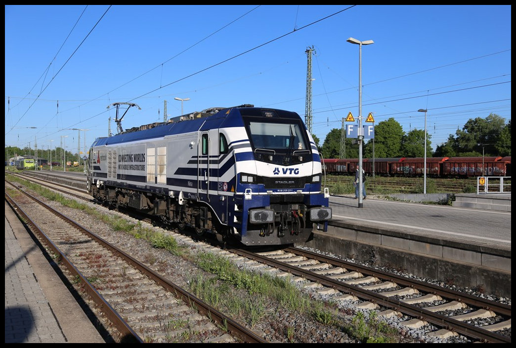 Auf dem Weg mit dem Alex nach Prag erreicht hier als RE aus München einfahrend die ES64U2-097 am 13.5.2025 um 7.30 Uhr den Bahnhof Landshut.