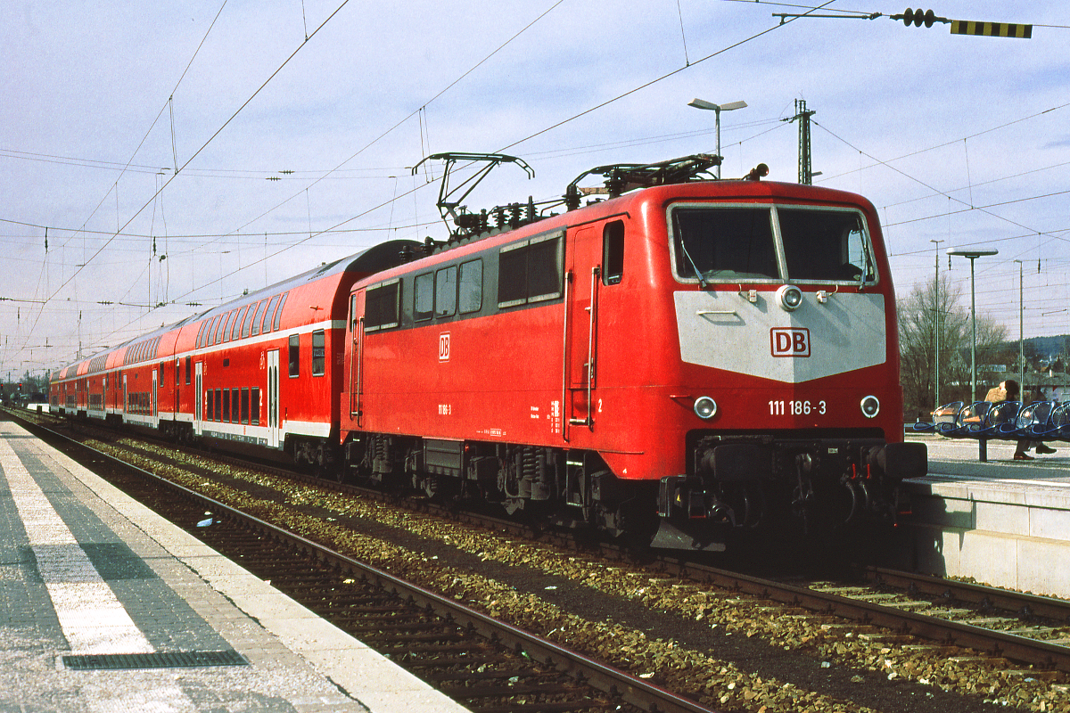 Hier wartet die 111 186 am Morgen des Samstag, 27. März 1999 in Landshut (Bayern) Hauptbahnhof mit einem Regionalexpress aus München auf die Weiterfahrt nach Regensburg.