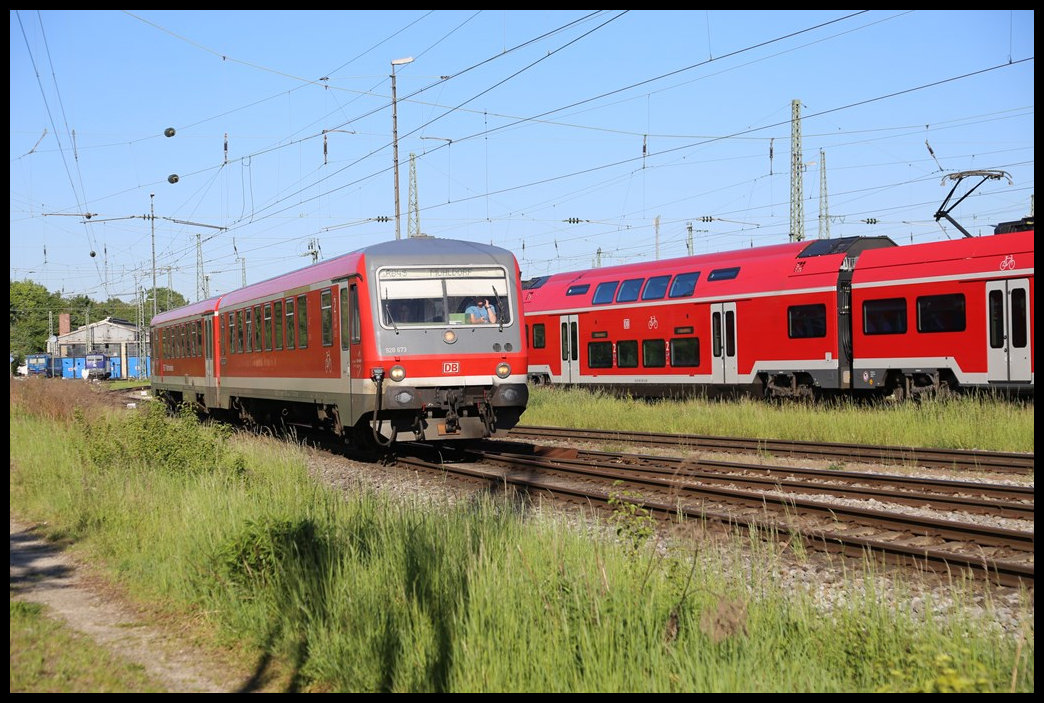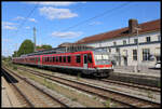 RB 44 erreicht hier aus Rosenheim kommend am 13.5.2025 um 7.37 Uhr in Form eines VT 628 den Bahnhof Landshut. Der Steuerwagen 928581 steht dabei im Vordergrund.