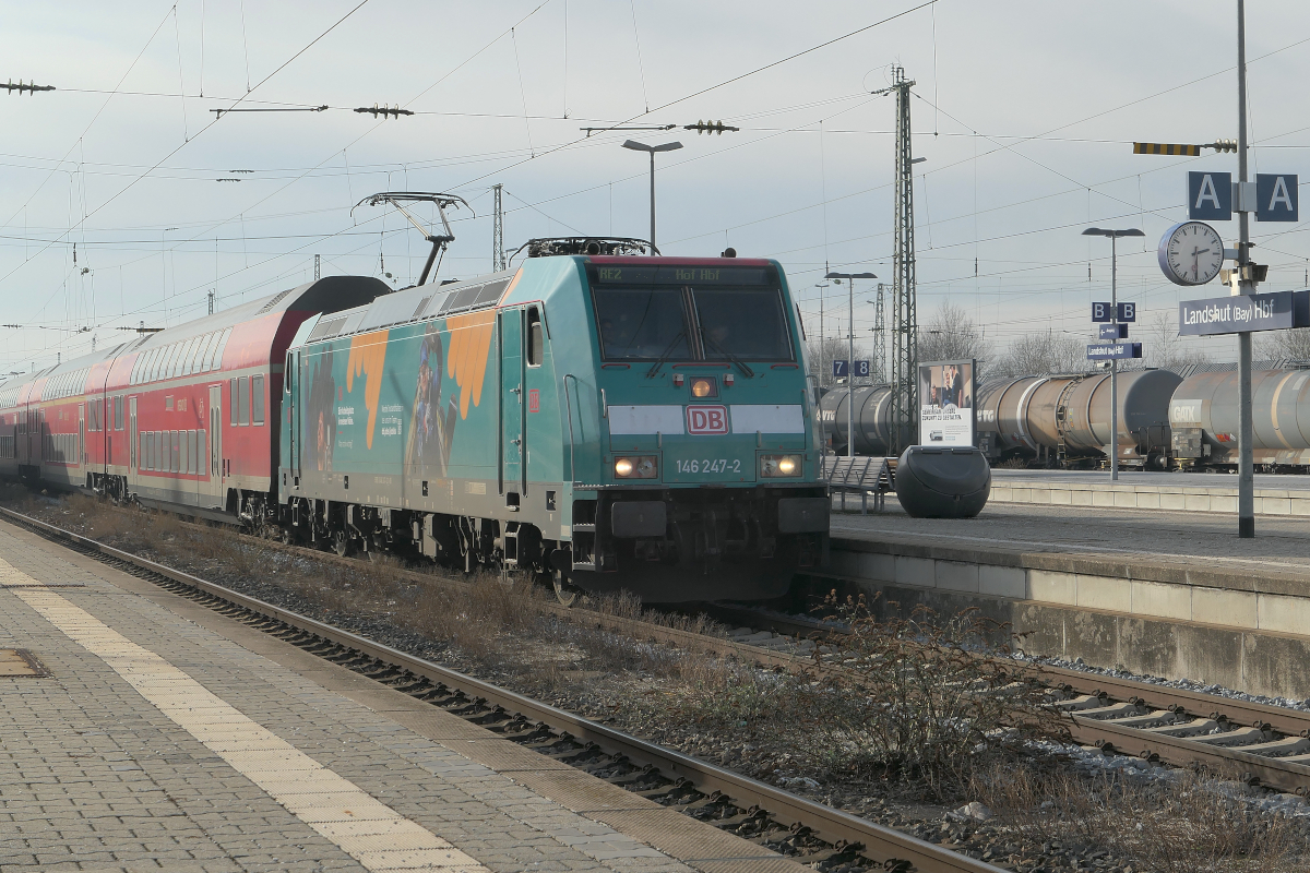 Etwa 20 Minuten vor dem RE2 München - Hof fährt der RE3 München - Passau. So konnte ich die 146 247 mit ihrem RE2 an zwei Orten fotografieren - in München und in Landshut (Bayern) Hbf.