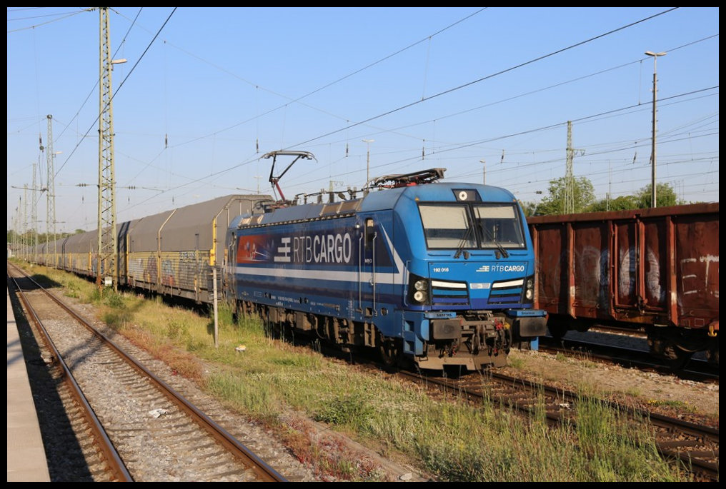 RTB Cargo 192016 wartet hier am 13.5.2025 um 7.16 Uhr im Bahnhof Landshut mit ihrem Autotransportzug auf die Weiterfahrt in Richtung Plattling.