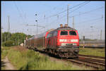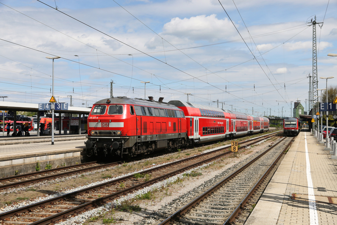 Die DB 218498-4 ist am 13.05.2025 morgens aus Rosenheim mit einem Doppelstockzug in Landshut angekommen. Nach dem Ausstieg der Fahrgäste schiebt sie nun hie um 7.46 Uhr die komplette Garnitur in die Abstellung.