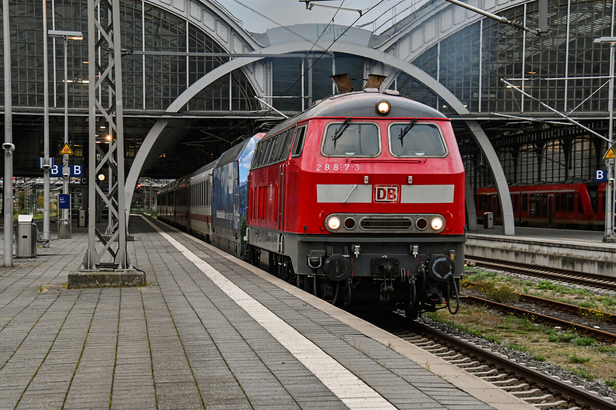 D-DB 218 837-3, D-DB 101 039-6 und D-DB 80-91 126-5 (Bpmmbdzf 286.1) fuhren am 14.10.2025 als IC 2264 nach Rostock Hbf (WR). Hier bei der Ausfahrt aus dem Lübecker Hbf (AL). Jan Ringer
