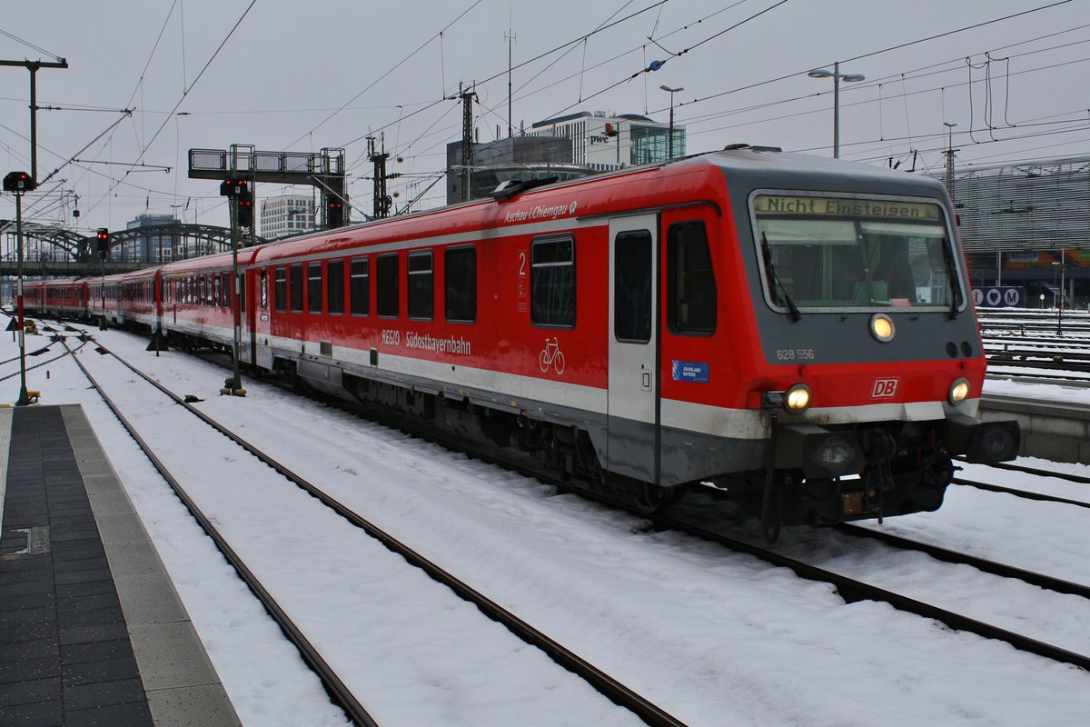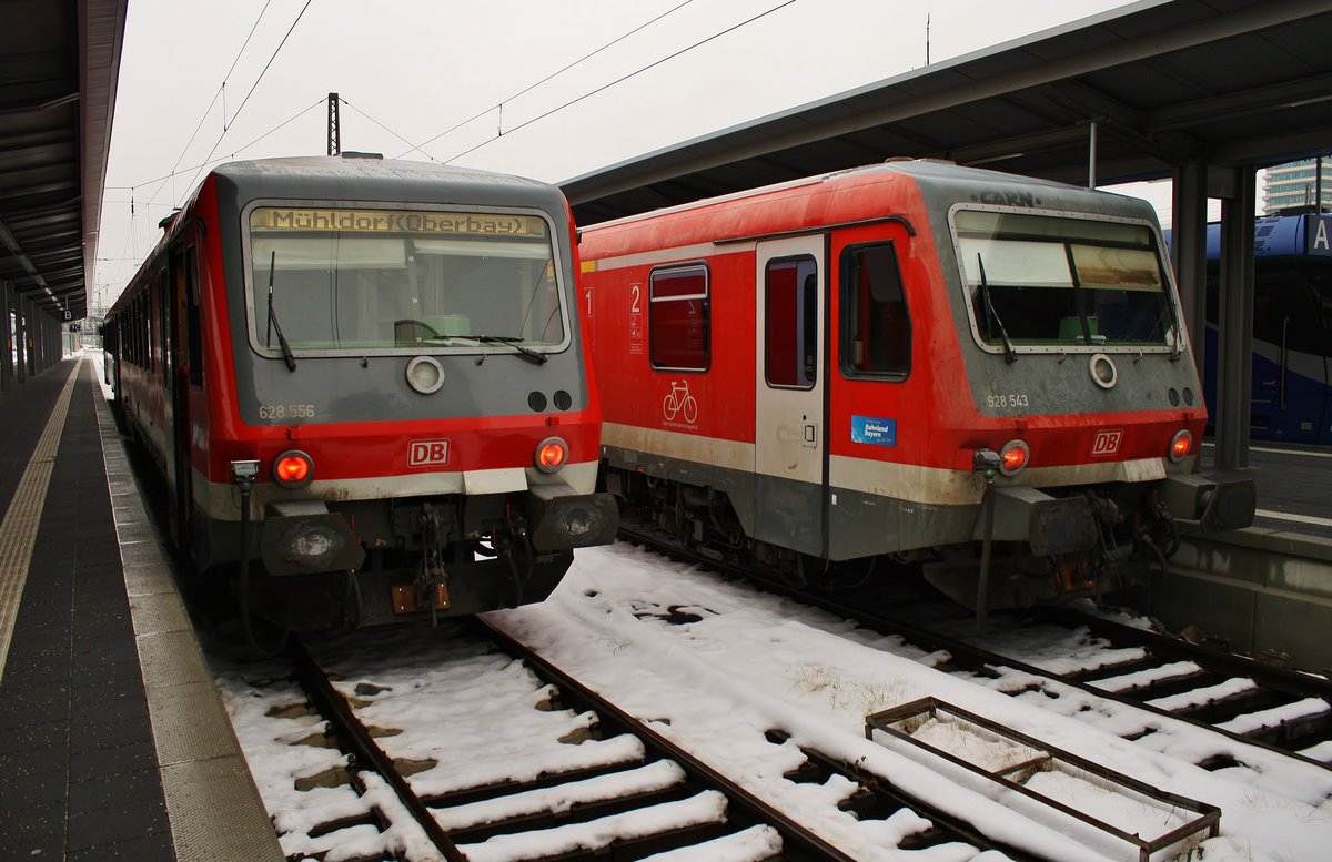628 556-2 "Aschau i. Chiemgau" trifft am 7.1.2019 als RB27025 nach Mühldorf(Oberbay) im Münchener Hauptbahnhof auf 928 543-7 als RB27346 von Wasserburg(Inn). Alexander