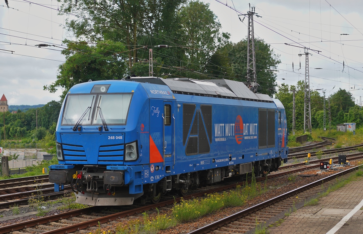Die Northrail-Zweikraftlok 248 048, vermietet an Hamburger Rail Service GmbH & Co. KG, ist am 17.07.2024 im Osnabrücker Hauptbahnhof abgestellt Horst Lüdicke