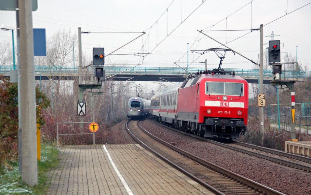 Fernverkehrsbegegnung am 28.11.10 in Petersroda: Während ICE 1613 nach Leipzig fährt, schiebt 120 112 ihren IC 1919 Richtung Berlin.