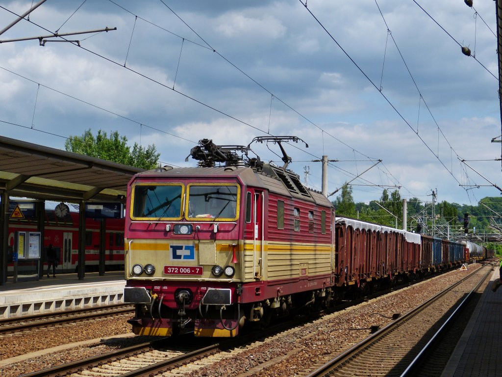 Zum Ende des Tages überraschte mich noch eine Personenzuggarnitur (leer) der České dráhy, a.s. (ČD) mit 371 002-7, die bei allerletztem Licht den Bahnhof Pirna auf Gleis 1 Richtung Tschechien durchfährt.