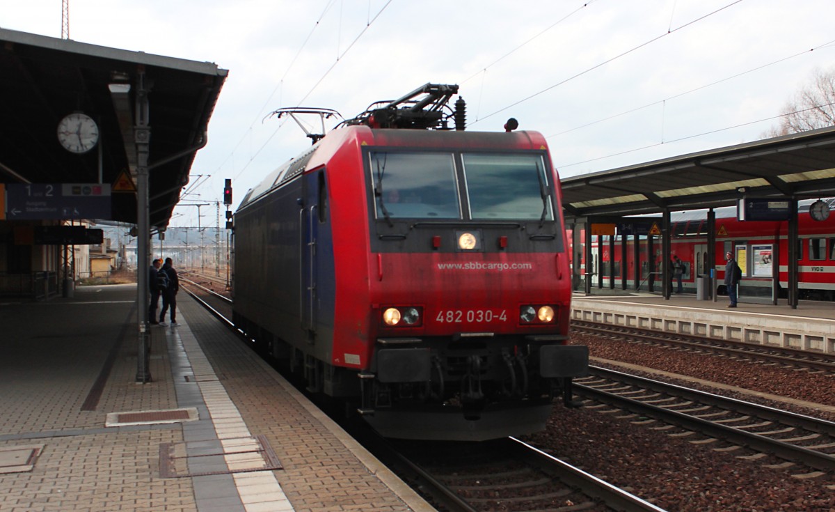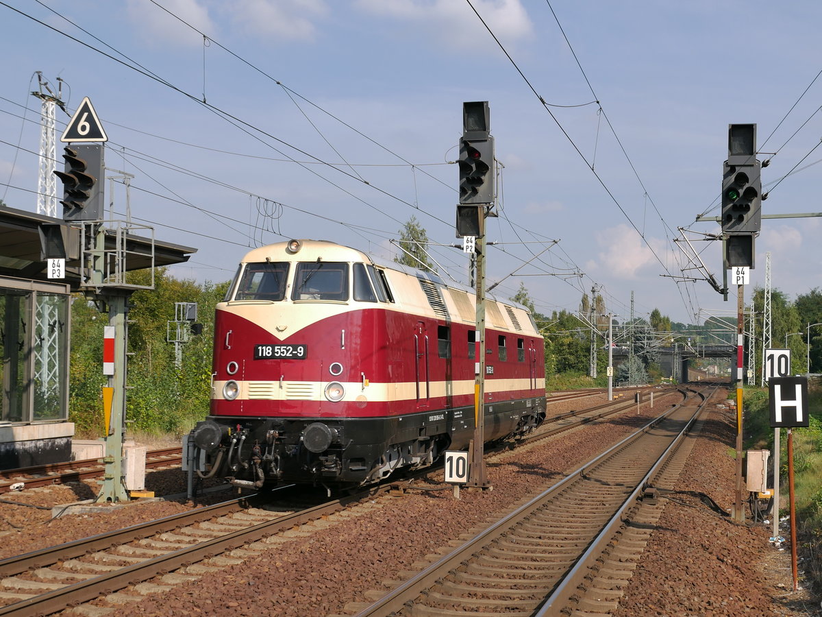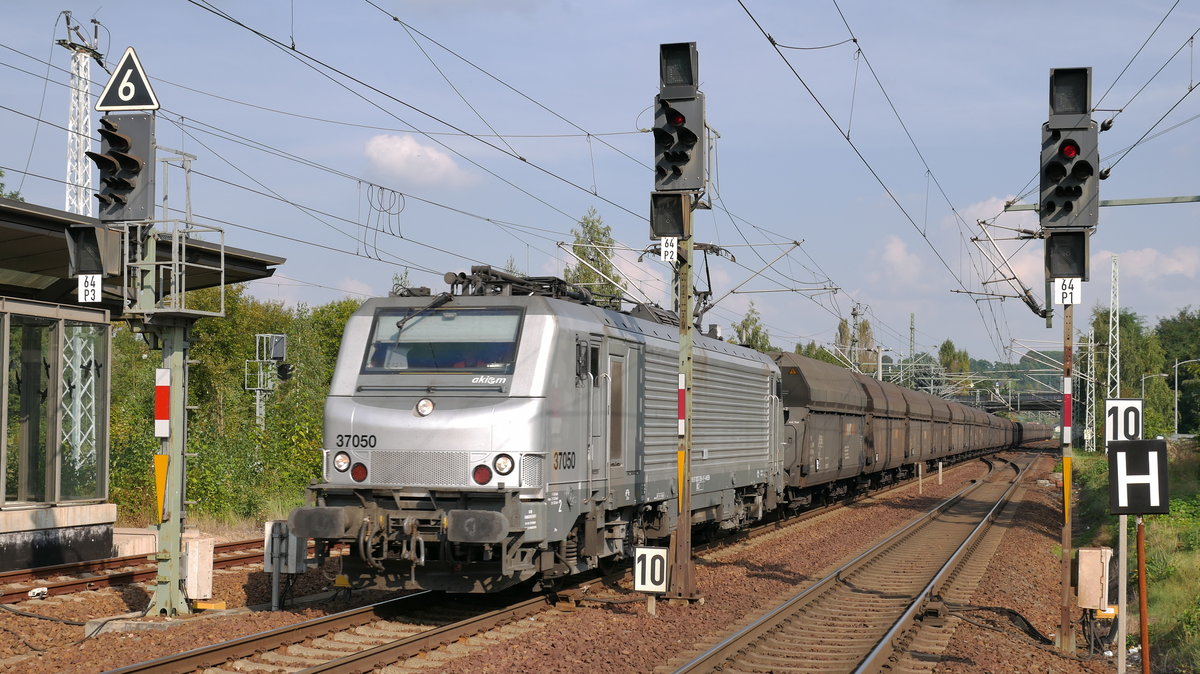 Getreidezug mit 155 119-1 der Fahrzeugwerk Karsdorf GmbH & Co. KG, vermietet an die Erfurter Bahnservice GmbH (EBS), durchfährt den Bahnhof Pirna auf Gleis 2 Richtung Pirna Gbf.