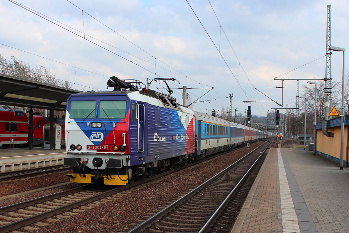 Nach einem zweistündigen Aufenthalt in Dresden fährt die 371 201-5 den Gegenzug zurück nach Bratislava hl.st. Hier kommt am 16.03.2015 der EC 177 (Berlin Hbf (Tief) - Bratislava hl.st.) durch Pirna gefahren. Matthias Hartmann