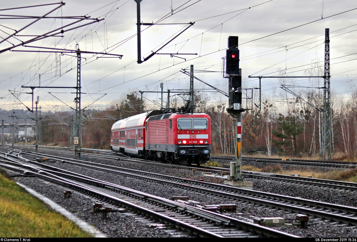Nachschuss auf 143 909-0 der S-Bahn Dresden (DB Regio Südost) als S 32748 (S2) nach Dresden Flughafen, die den Startbahnhof Pirna auf Gleis 3 (Bahnsteig 1), mittlerweile bei Regenwetter, verlässt.