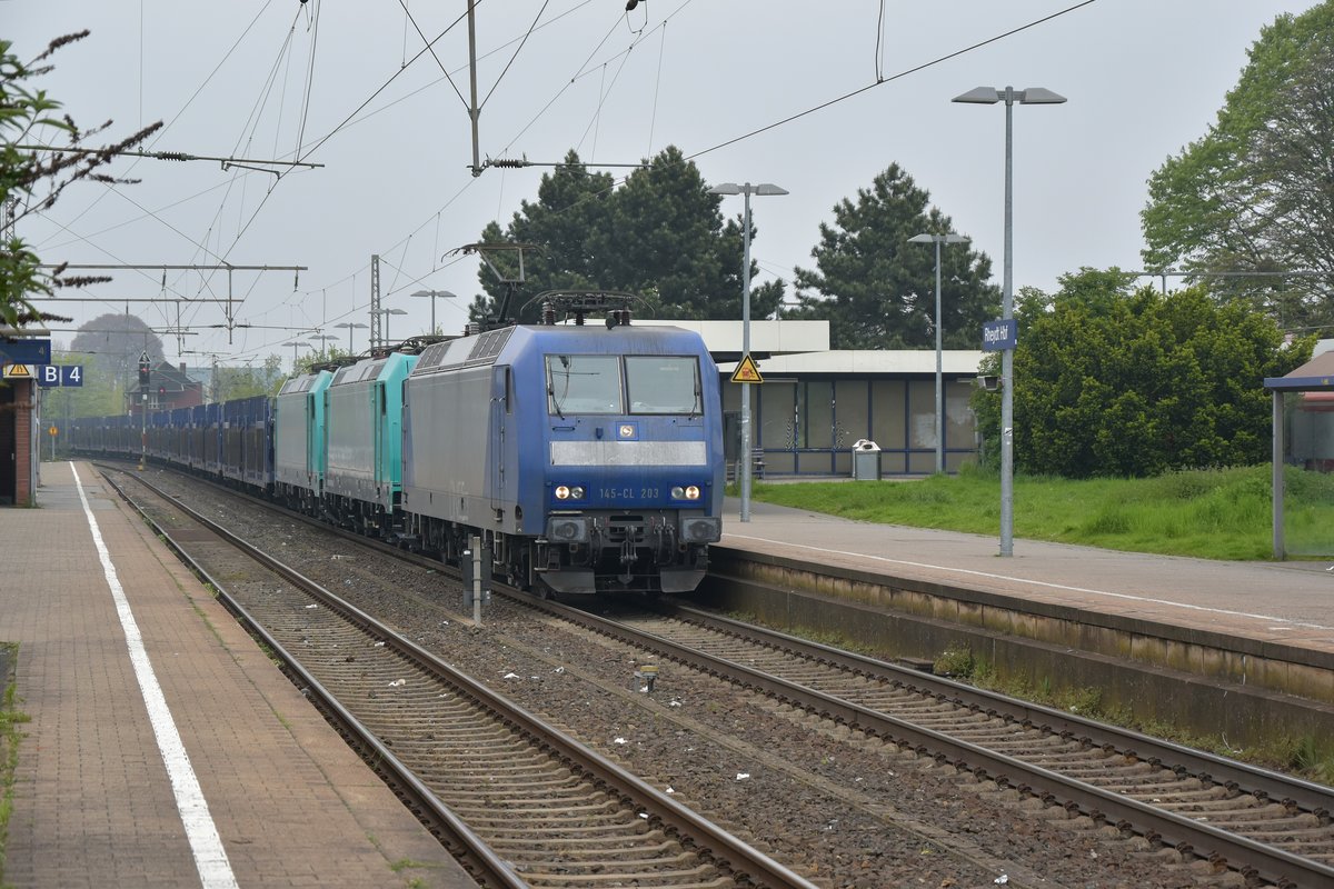 Neben leeren Autotransportwagen am Haken, sind auch noch zwei 185 der Crossrail hinter der 145-CL 203 kalt angehangen. Hier ist am Sonntagmorgen der Zug bei der Durchfahrt in Rheydt zusehen, als ich auf Hermann-Josef gewartet habe. 7.5.2017 Andreas Strobel