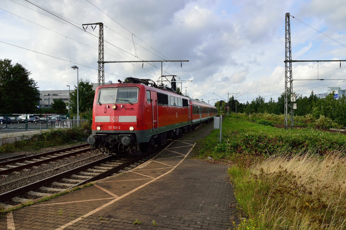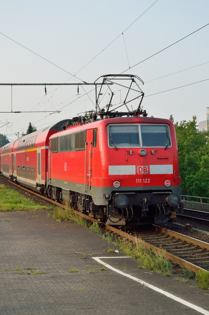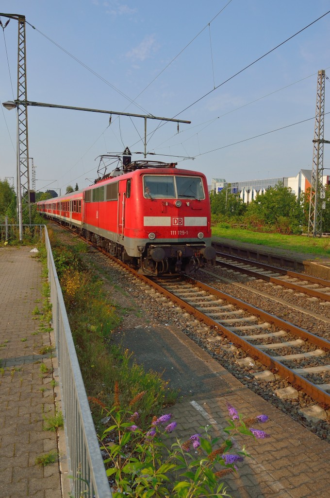 Als Verstärkerzug kommt diese RE 4 auf Gleis 4 des Rheydter Hbf eingefahren, gezogen von der 111 125-1. Bald setzt sie ihre Fahrt nach Aachen Hbf fort. 29.8.2013 Andreas Strobel