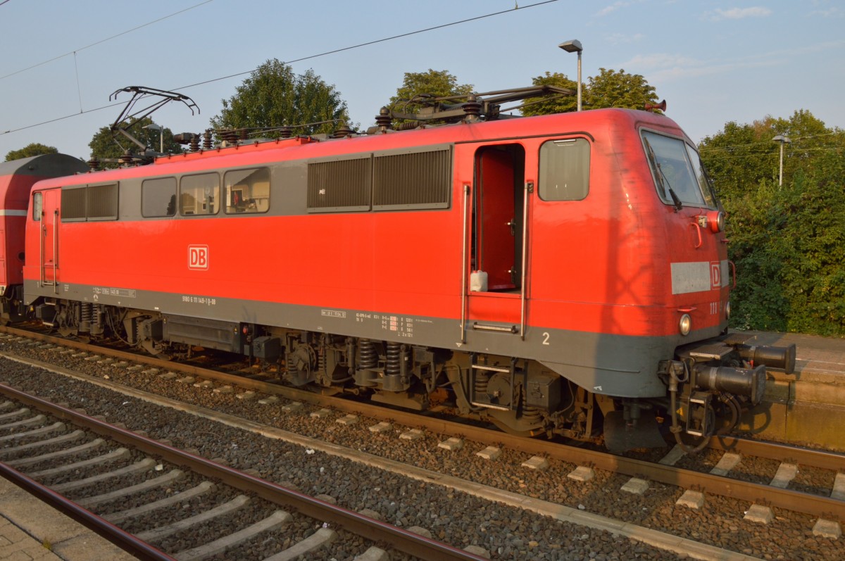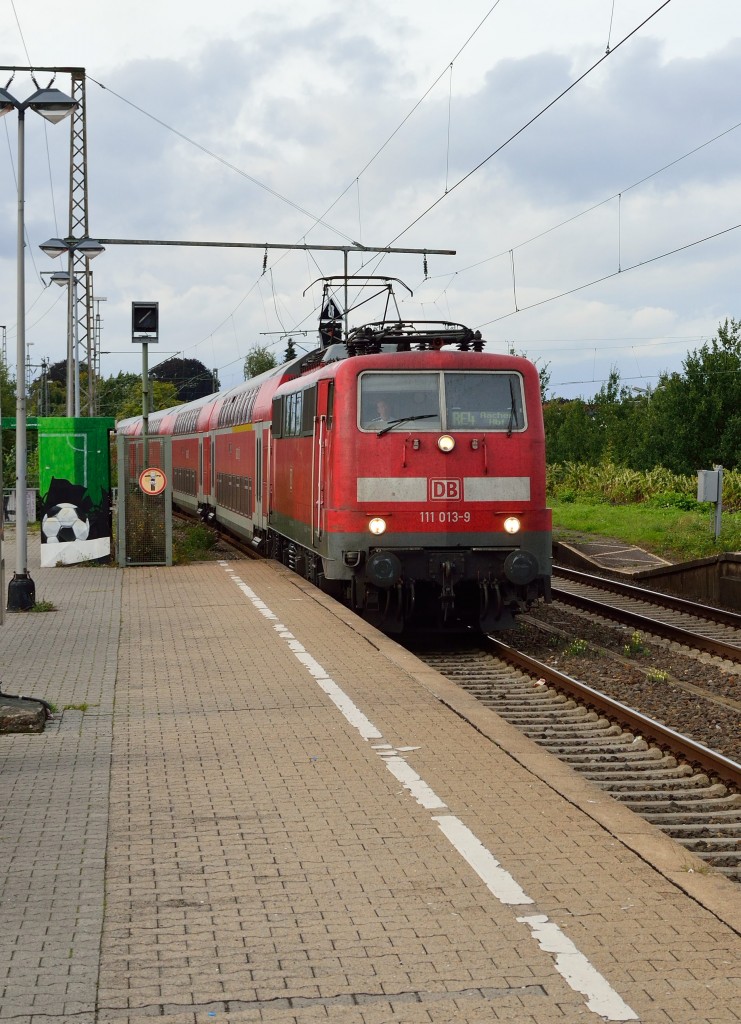 Am Dienstagabend den 10.9.2013 kommt die 111 013-9 mit einem Dostockzug als RE4 in Rheydt Hbf auf Gleis 4 eingefahren auf ihrem Weg nach Aachen Hbf. Andreas Strobel