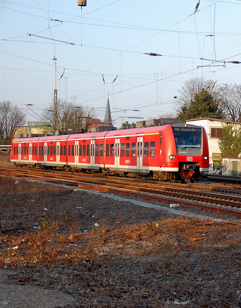 Kurz hinter dem alten Stellwerk Rpn sehen wir am 8.4.2011 eine RB 33 bei der Einfahrt in den Bahnhof Rheydt Hbf, es ist der 425 083-3 auf dem Weg nach Aachen Hbf. Andreas Strobel