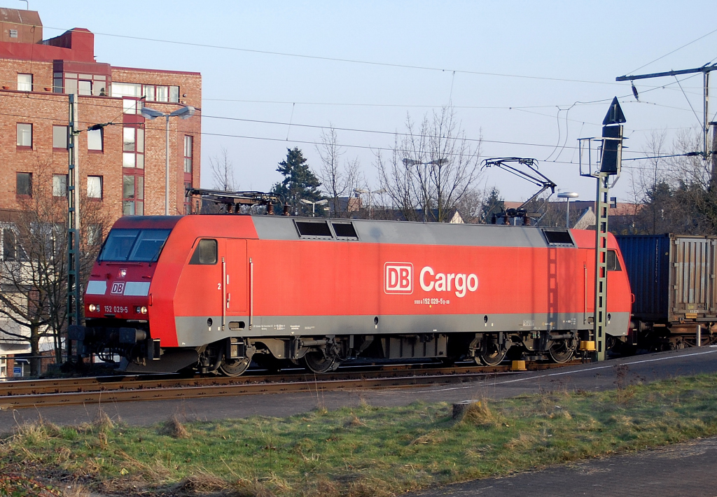 Als Umleiterzug kommt die 152 029-5 mit einem Alurollenzug durch Rheydt gefahren. Wegen Bauarbeiten auf der KBS 495 muss er einen Umweg Richtung Norden nehmen. 2.3.2011 Andreas Strobel
