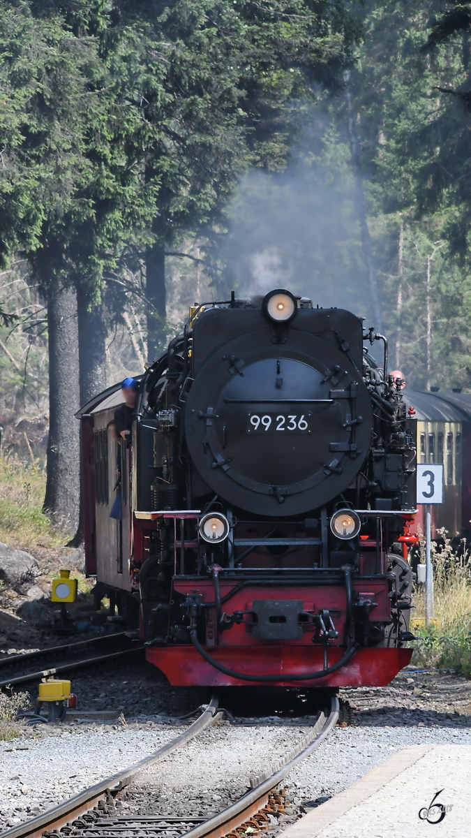 Die Dampflokomotive 99 236 fährt in den Bahnhof Schierke ein, 99 222 wartet auf die Weiterfahrt in Richtung Wernigerode. (August 2018) Christian Bremer