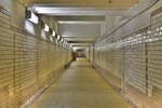 Blick durch den Röxer Tunnel. Durch die Bauarbeiten in der anderen Unterführung ist dieser die einzige Möglichkeit zu den Bahnsteigen zu gelangen. Nach den Umbauarbeiten wird der Röxer Tunnel verfüllt.