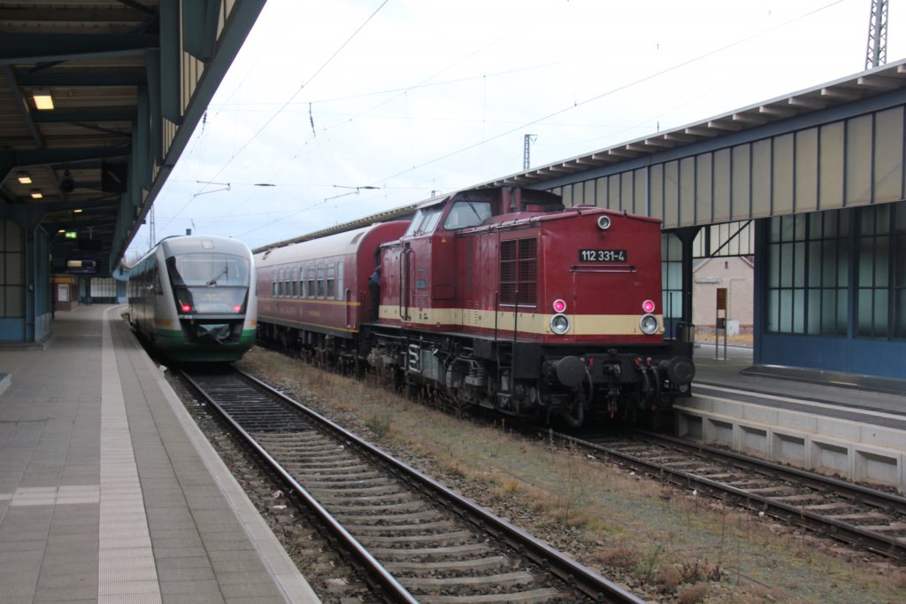 Am 17.12.2011 war ein Sonderzug von Dresden nach Karlovy Vary unterwegs.Gezogen wurde die Fuhre von Press 112 565 mit tatkräftiger Schubunterstützung von 112 331 der Ostsächsischen Eisenbahnfreunde.Hier bei der Einfahrt in den Zwickauer Hauptbahnhof. Steffen Eule
