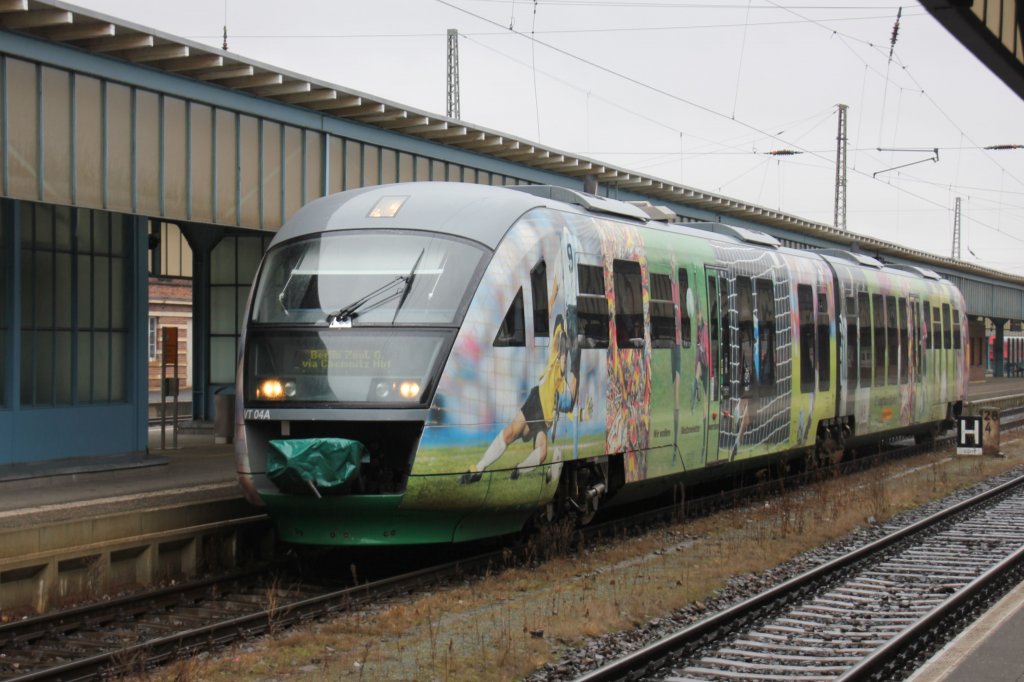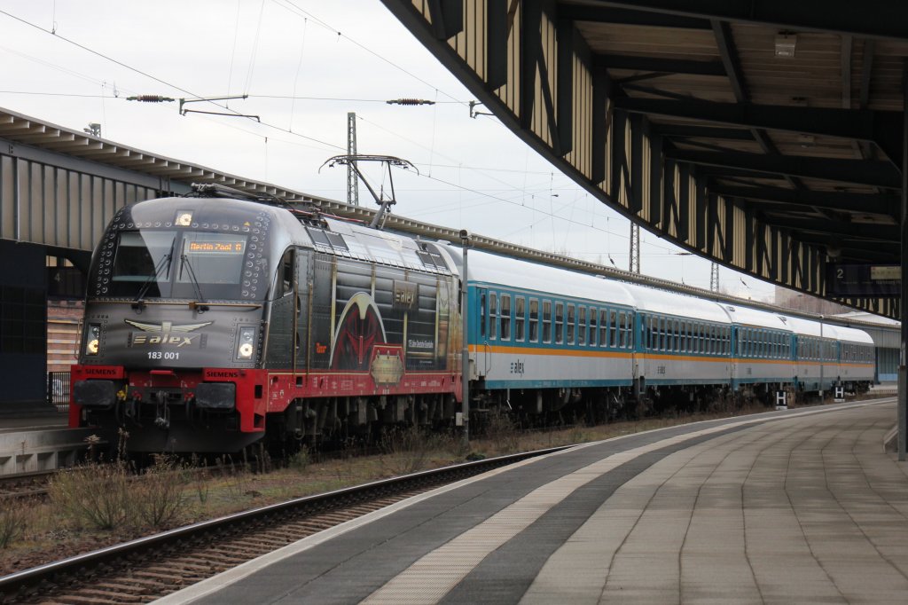 Zu Weihnachten und bis ins neue Jahr verkehrt der VX Lokbespannt.183 001 mit 5 Alexwagen wartet auf die Abfahrt nach Berlin(Zoo).Zwickau(Hbf.)26.12.2011. Steffen Eule