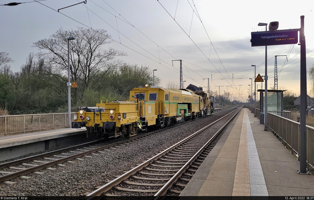 Nachschuss auf eine Universalschotterplaniermaschine Plasser & Theurer USP 2000 SWS und Plasser & Theurer Stopfexpress 09-3X (NVR-Nummern unbekannt) bei der Fahrt durch den Bahnhof Teutschenthal Richtung Halle (Saale). Zusammen mit zwei anderen derartigen Tandems hatten sie zwischen Halle Rosengarten und Angersdorf den neu aufgebrachten Schotter noch einmal verdichtet. Dies geschah im Rahmen einer Vollsperrung vom 22. bis 25. April. 🧰 JumboTec GmbH 🕓 13.4.2022 | 18:37 Uhr