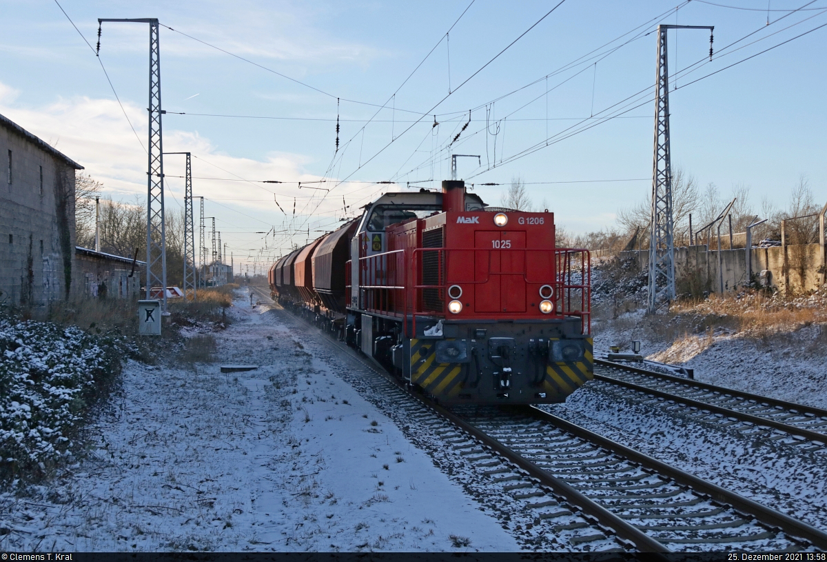 In der Nacht zum 1. Weihnachtsfeiertag hatte es passenderweise geschneit. 275 027-1 (Lok 1025 | MaK G 1206) trotzt dem Frost und der Feiertagsruhe und ist, wie jeden Samstag, mit Kalk im Bahnhof Teutschenthal Richtung Halle (Saale) unterwegs.