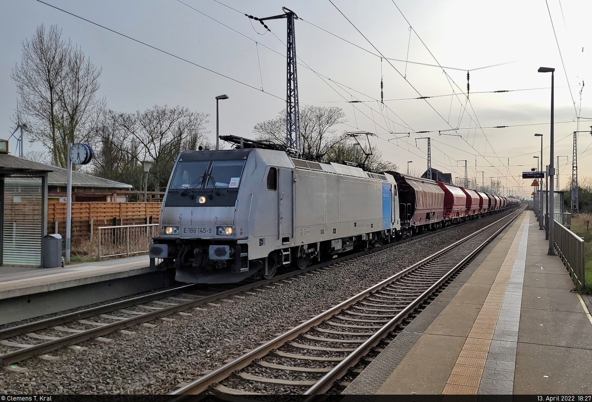 Kalizug mit 186 145-9 durchfährt den Bahnhof Teutschenthal auf Gleis 1 Richtung Halle (Saale). 🧰 Railpool GmbH, vermietet an DB Cargo 🕓 13.4.2022 | 18:27 Uhr