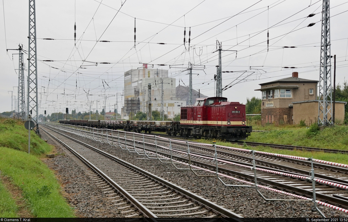 VDE 8 Komplexmaßnahme Halle Rosengarten–Angersdorf ▶ Standort: Bahnhof Teutschenthal Hochbetrieb am Schotterwerk Teutschenthal: Rangieren in drei Zügen – Mit leeren Flachwagen im Gepäck ging es für 203 229-0 (DR V 100.1) zunächst auf den Ablaufberg, danach auf das Nachbargleis und nun auf Gleis 3, um sich zur Abfahrt bereitzumachen. Dabei passiert der Zug immer wieder das Fahrdienstleiter-Stellwerk "B1" (rechter Bildrand). 🧰 Cargo Logistik Rail Service GmbH (CLR) 🚩 Bahnstrecke Halle–Hann. Münden (KBS 590) 🕓 15.9.2021 | 13:52 Uhr