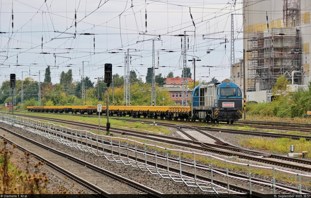 VDE 8 Komplexmaßnahme Halle Rosengarten–Angersdorf ▶ Standort: Bahnhof Teutschenthal Im Laufe des Nachmittags hat sich 273 005-9 (V 1001–033 | Vossloh G 2000 BB) wieder an die gelben Flachwagen gesetzt, mit denen sie am Vortag hier ankam. Der Zug wurde jetzt in zwei Hälften geteilt, sodass er vermutlich am nächsten Tag ins benachbarte Schotterwerk fährt. 🧰 Alpha Trains Belgium NV/SA, vermietet an die STRABAG Rail GmbH (STRABAG SE) 🚩 Bahnstrecke Halle–Hann. Münden (KBS 590) 🕓 15.9.2021 | 18:57 Uhr