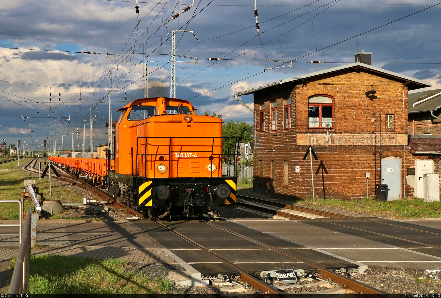 Auch wenn fast nichts darauf hindeutet: Das Bild ist im Jahr 2024 entstanden. 345 137-4 (105 137-4 | DR V 60 D) brummt mit farblich passenden, recht neu aussehenden Flachwagen der Bezeichnung  Rens<sup>2</sup>  durch den Bahnhof Teutschenthal Richtung Röblingen am See und passiert dabei das elektromechanische Weichenwärter-Stellwerk  W2 .