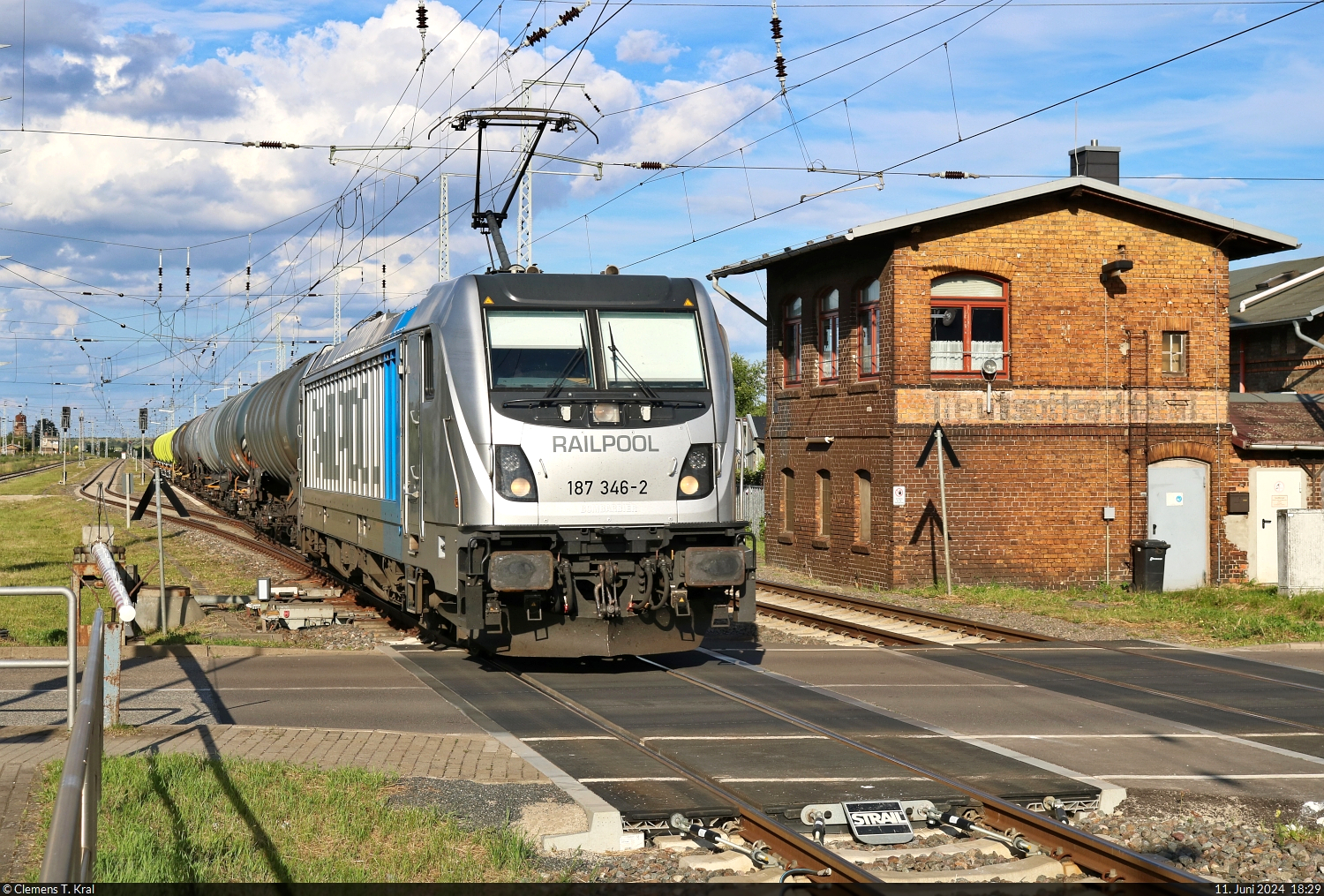 Auf Höhe des Weichenwärters durchfährt ein Kesselzug mit 187 346-2 den Bahnhof Teutschenthal Richtung Sangerhausen. Dieses Motiv ist am Zugang zu Bahnsteig 2 möglich – jedoch nur noch für rund ein Jahr, da "W2" dann vom Netz geht. 🧰 Railpool GmbH, vermietet an die ecco-rail GmbH 🕓 11.6.2024 | 18:29 Uhr