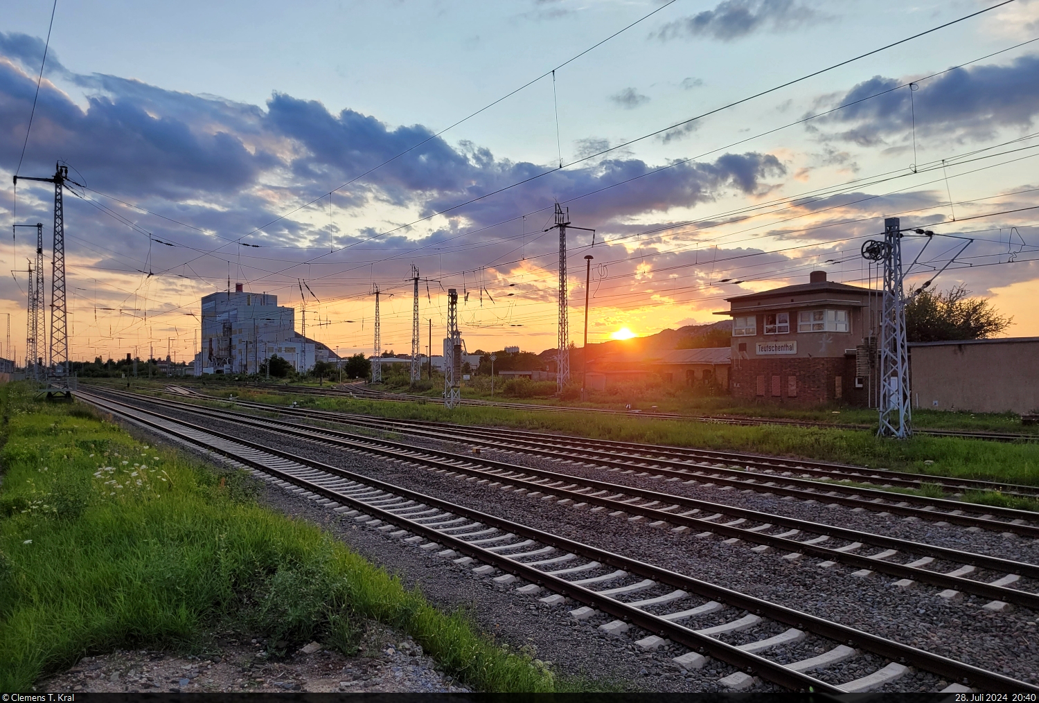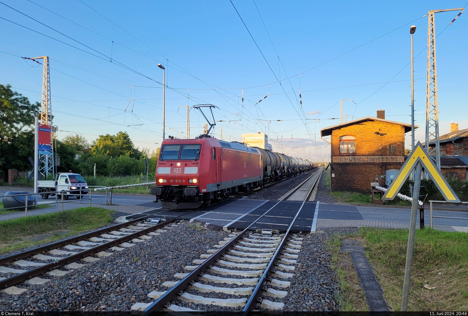 EZ mit 185 056-9 fährt am wärterbedienten Bahnübergang des Bahnhofs Teutschenthal gen Sonnenuntergang. Nur der obere Gebäudeteil des Stellwerks wird noch angestrahlt. Gesehen am Weg zu Bahnsteig 1. 🧰 DB Cargo 🕓 11.6.2024 | 20:46 Uhr