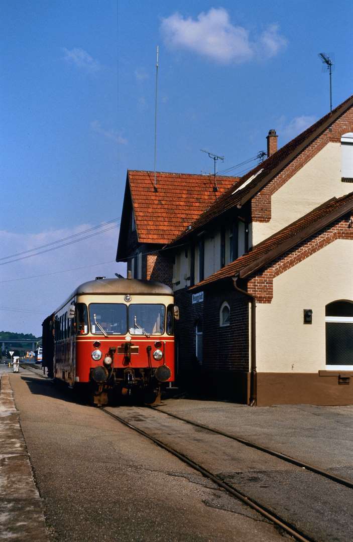 Gmeinder-Auwärter-Schienenbus T 24 der Unteren Kochertalbahn (WEG) am Bahnhof Neuenstadt am Kocher (27.08.1985) Frank Nowotny