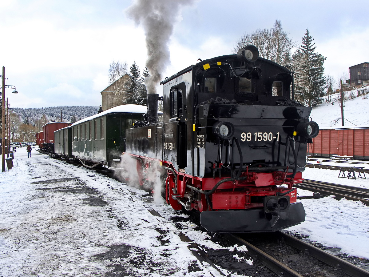 Zwischen den Jahren fand bei der Preßnitztalbahn zwischen Jöhstadt und Steinbach Zweizugbetrieb statt. Dabei kamen 99 1590 und 99 1715 zum Einsatz. Hier zeit die 99 1590 am 28.12. einen der Züge nach Jöhstadt an der Fahrzeughalle kurz hinterm Haltepunkt Schlössel vorbei. Robin Kunze