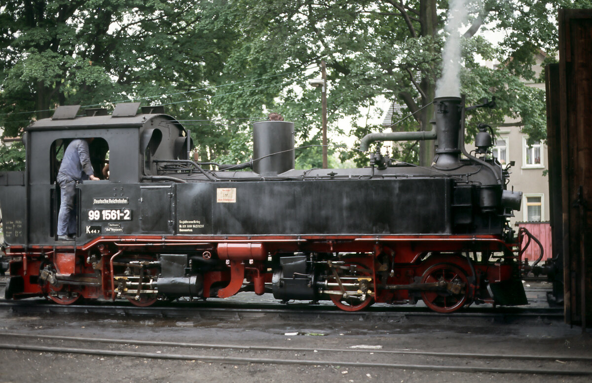 Die DR 99 1561 - 1909 von Hartmann Chemnitz an die Sächsischen Staatseisenbahnen mit der Fahrzeugnummer 151 geliefert - nähert sich am 29.07.1991 dem Bf. Radeburg. Bis 1970 trug die Lok bei der DR die Nummer 99 561. Ernst Lauer