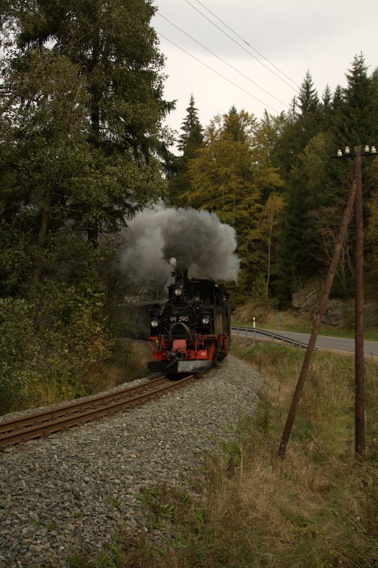 99 590 ist mit ihrem Personenzug zwischen den Haltepunkten Andreas Gegentrum-Stollen und Forellenhof unterwegs. Aufgenommen am 03.10.2009 Hendrik Flath
