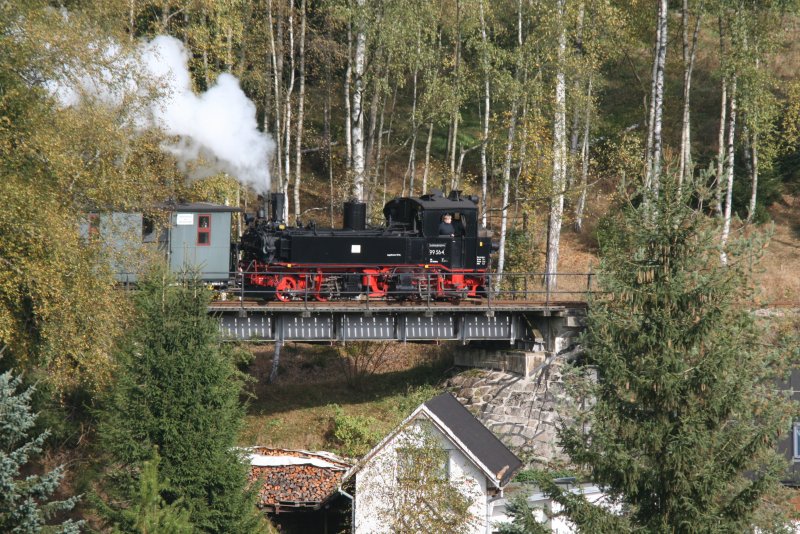 Am 03.und 04.10.09 fand das 3.WCd Schmalspurfestival auf der Museumsbahn Schönheide und dem Bahnhof Schönheide Süd statt.Hier dampft die Radebeuler Gastlok 99 564 talwärts nach Stützengrün. Steffen Eule