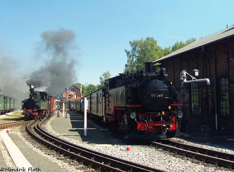 Die Doppelausfahrt aus dem Bahnhof Bertsdorf darf bei einem Besuch der SOEG nicht fehlen. 99 749 und IV K 145 (99 555) dampfen am 02.08.2009 aus dem Bahnhof Bertsdorf Hendrik Flath