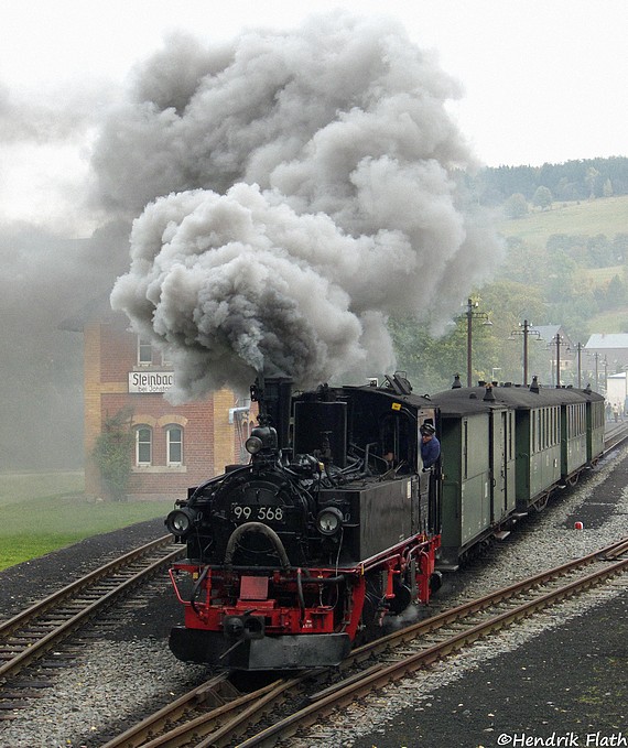 Eine Szenerie wie vor 40 Jahren: 99 568 ist mit ihrem Personenzug aus Wolkenstein gerade in Steinbach angekommen und wird gleich die Güterwagen mit in ihren Zug aufnehmen...
