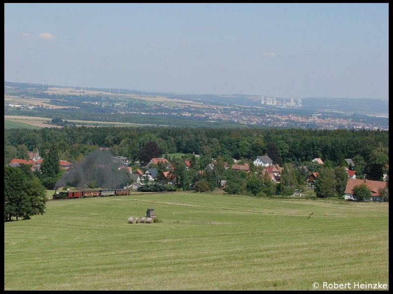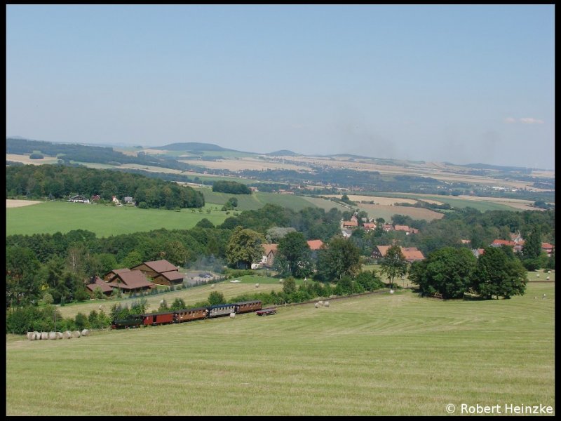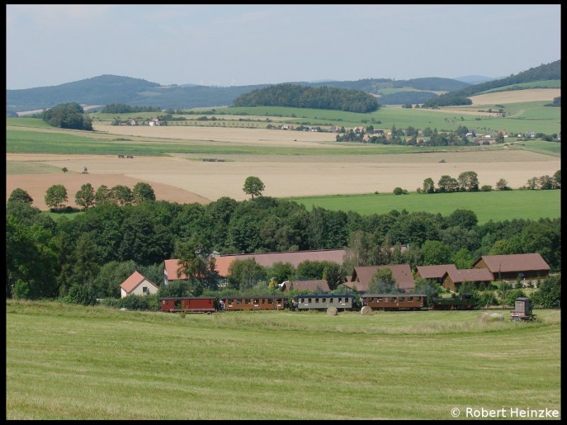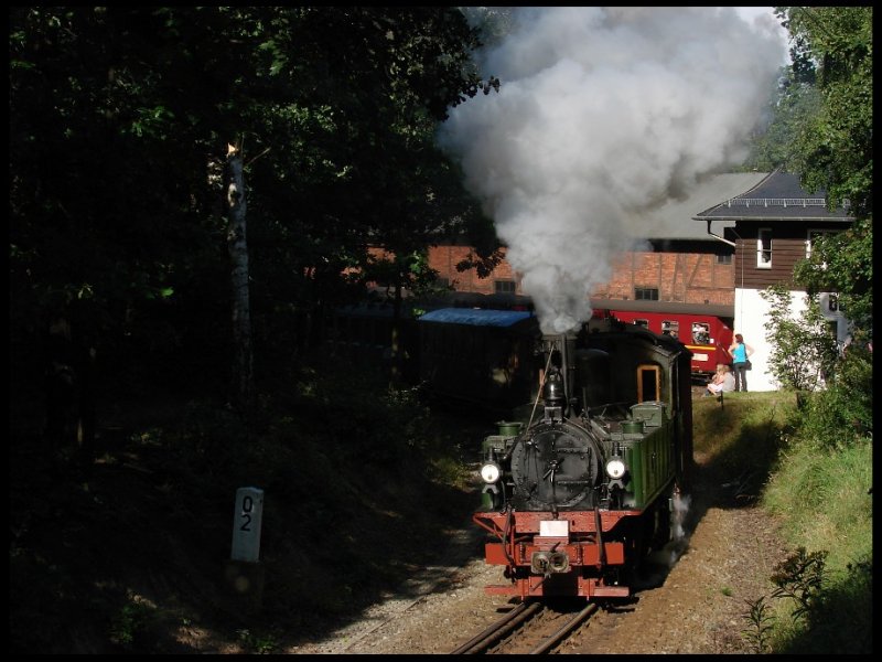 Dampflok 99 516 der Museumseisenbahn Schönheide dampft den Anstieg bei Schönheide hinauf. Die Aufnhame entstand am 12. September 2009.