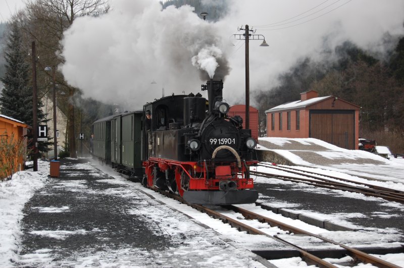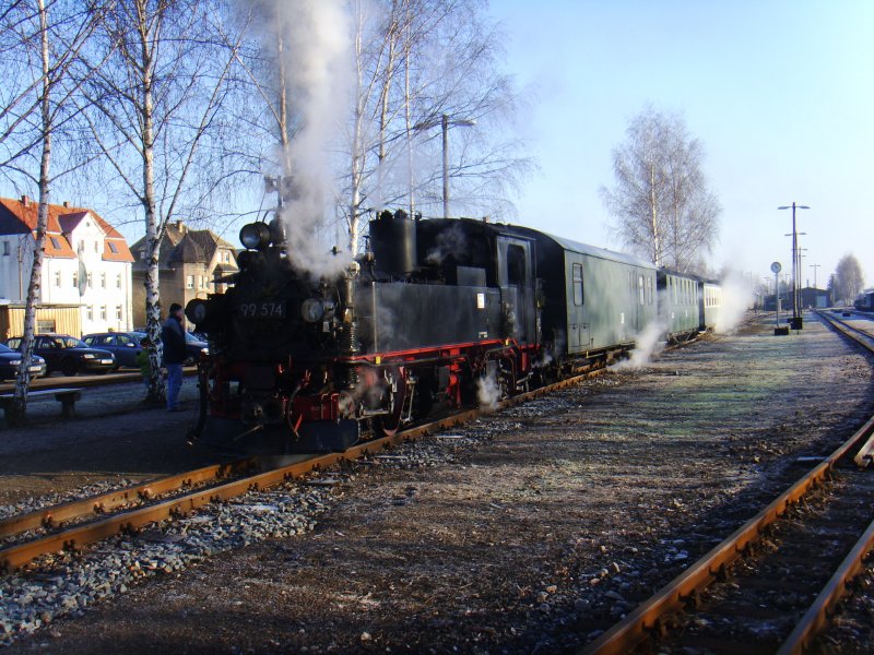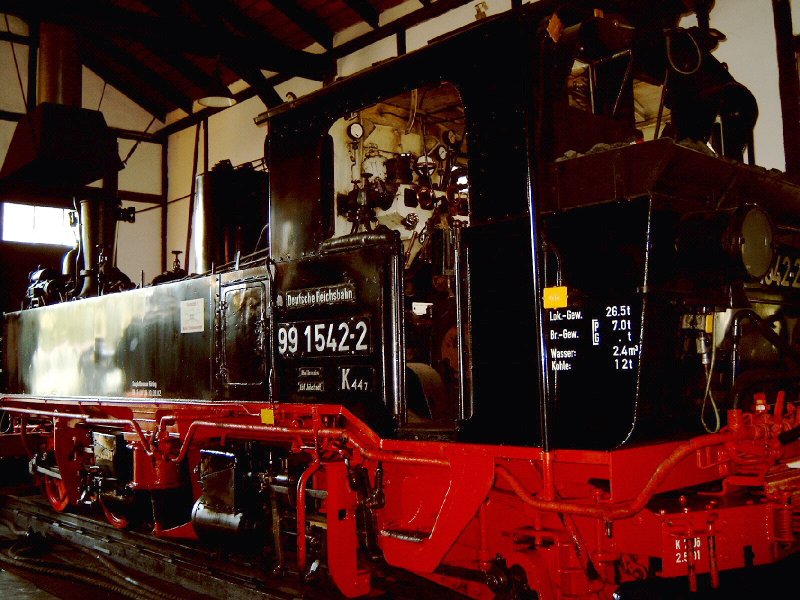Die beiden sächsische Neubau IV K 99 1562-0 (Neubau unter alter Nummer 1962) und 99 539 (Neubau unter alter Nummer 1963) sind am 31.01.09 in der Fahrzeughalle der Pressnitztalbahn ausgestellt. Daniel T.