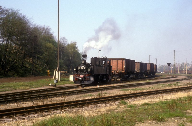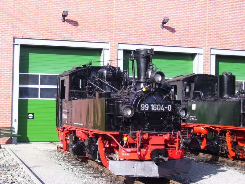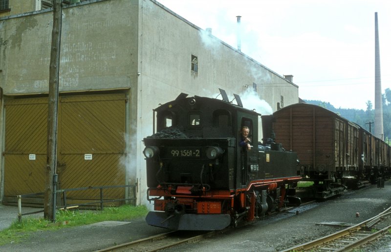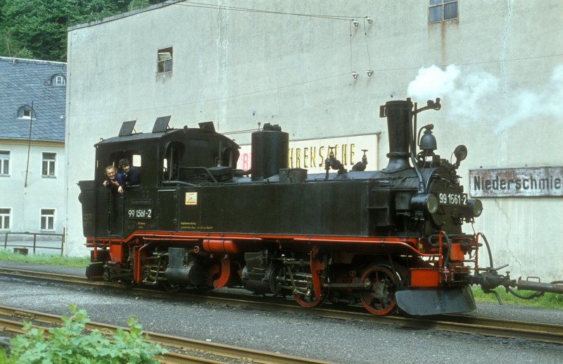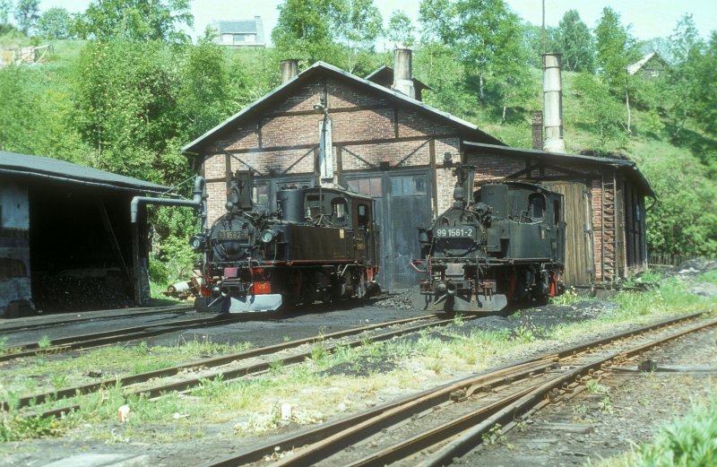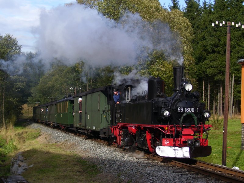 Vor 30 Jahren hätte es auch so aussehen können: 99 1568-7 fährt gerade mit dem nachmittäglichen Personenzug aus Wolkenstein in Jöhstadt ein. 99 1608-0 wird gleich den Personenzug nach Niederschmiedeberg übernehmen, um dort die Arbeiter des Kühlschrankwerkes wieder nach Hause zu bringen. Einziger Haken an der Sache: 99 1608 war, meines Wissens nach, nie in Jöhstadt beheimantet...Datum: 05.10.2008 Hendrik Flath