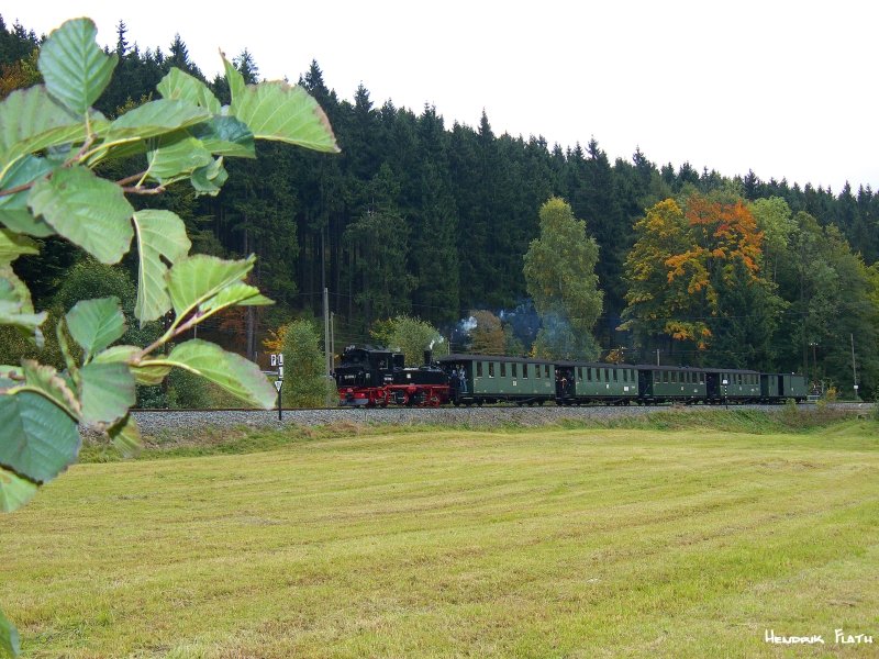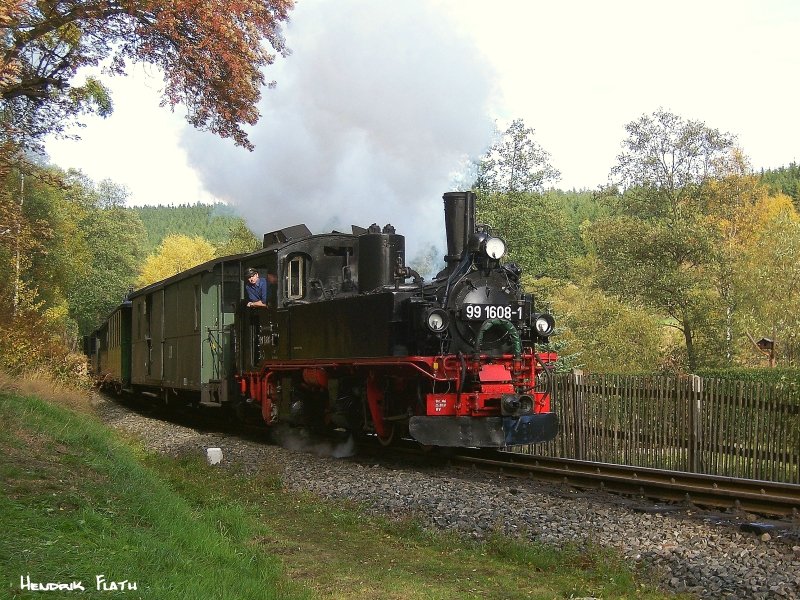 99 1590-1 rollt mit ihrem Personenzug nach Steinbach. Aufgenommen am 03.10.2008 zwischen dem Bahnhof Schmalzgrube und dem Hp Forellenhof. Hendrik Flath