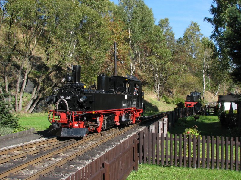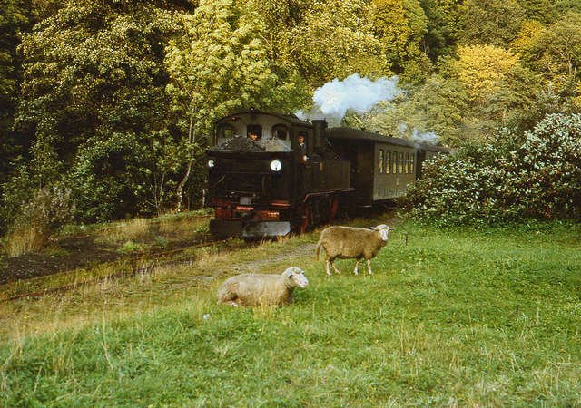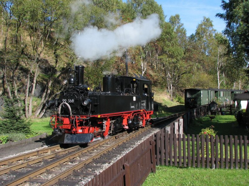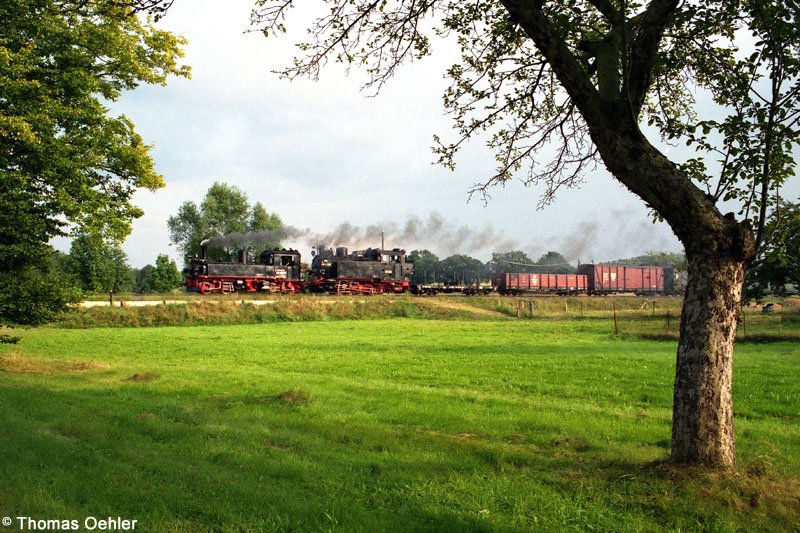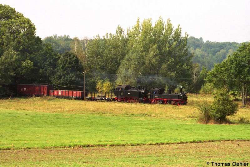 Im wunderbaren Licht der Abendsonne durcheilen 99 1608 und 99 713 das flache Promnitztal mit ihrem GmP. Hier im September 2005 kurz vor dem Hp Berbisdorf. Thomas Oehler